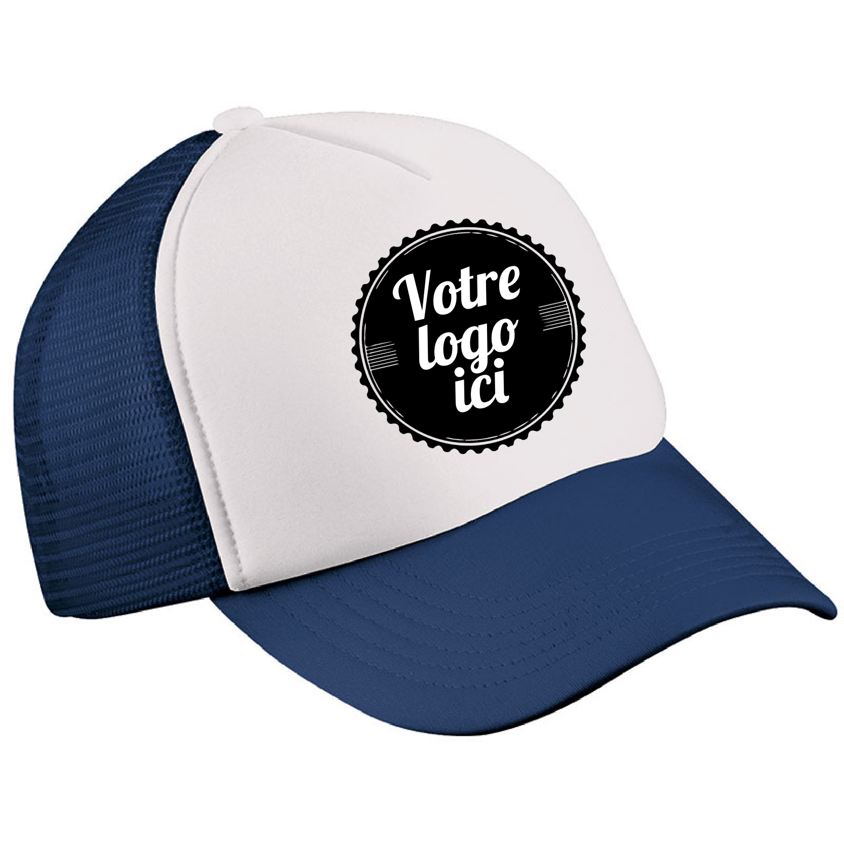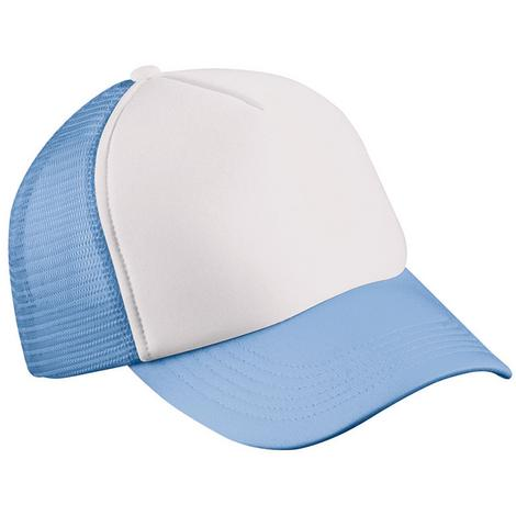 100% polyester. Casquette enfant 5 panneaux. Fronton renforcé. Insert filet arrière. 6 surpiqûres. Bandeau de transpiration satin. Fermeture plastique. Visière