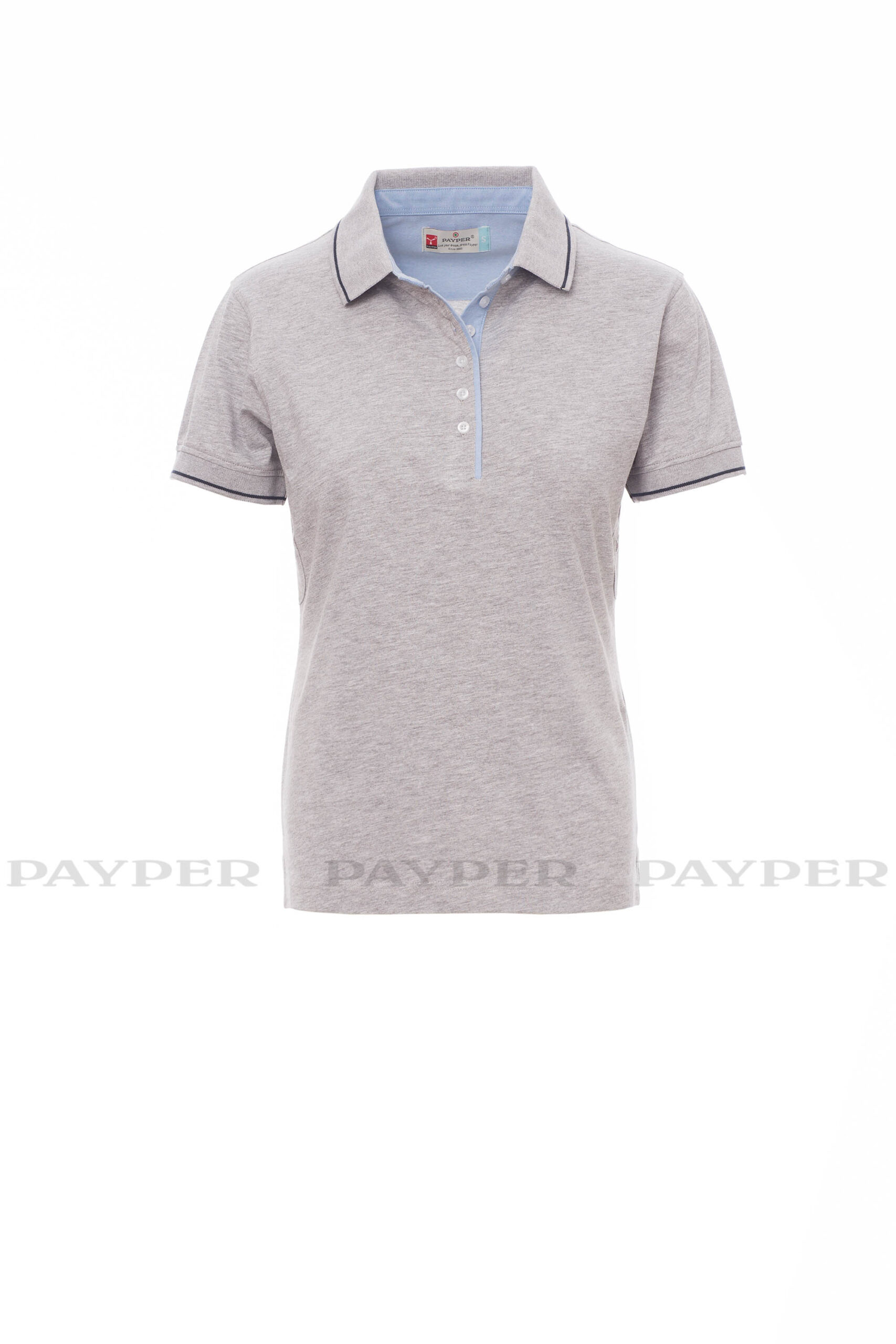 Polo pour femme cintré, à manches courtes avec trois boutons blancs, avec intérieur du col, patte et fentes latérales en Oxford bleu ciel, col et bordure des manches en bord-côte élastique avec un profil fin en contraste, œillets sous les bras.