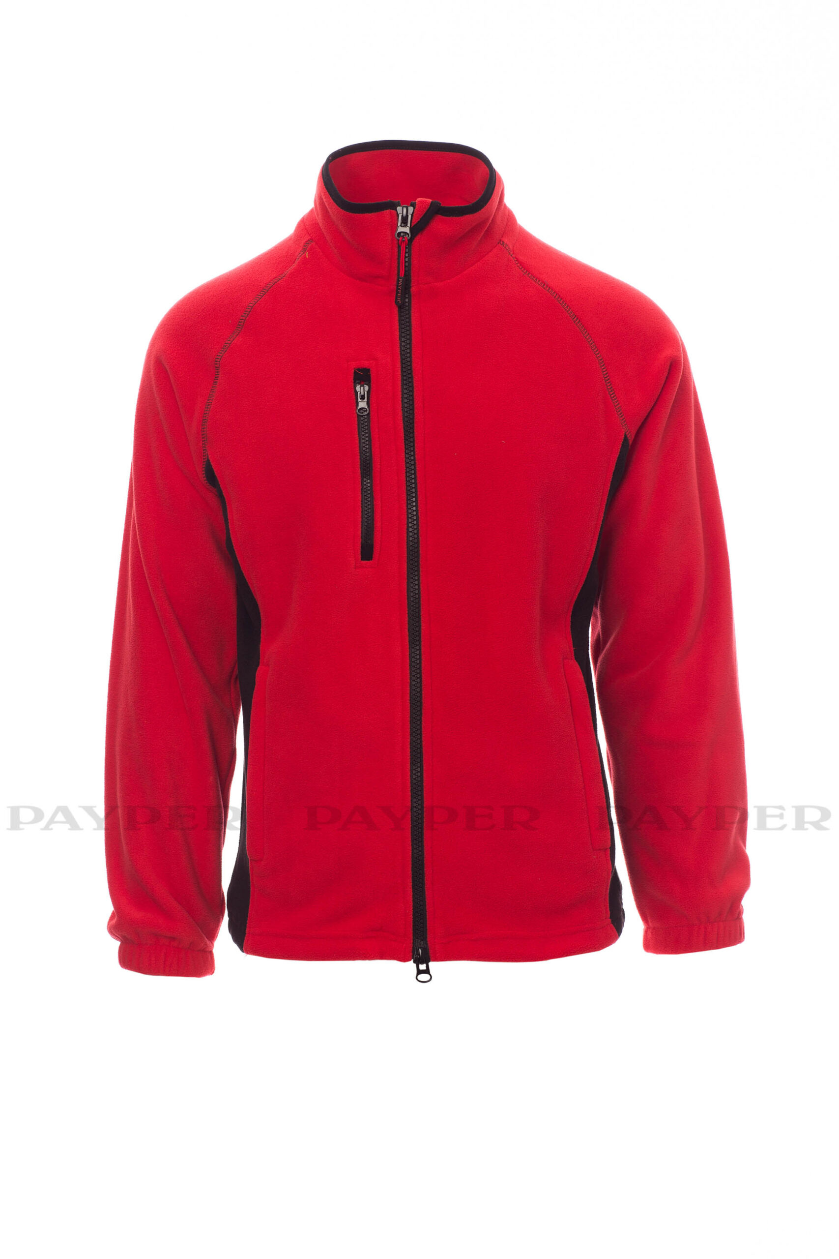 Veste polaire bicolore pour homme à zip intégral de 8 mm en plastique noir, manches raglan, coulisse réglable à la taille, élastiques serre-poignet, deux poches avec zips couverts, une poche avec zip sur le devant, col avec bordure de renfort en contraste, coutures renforcées.