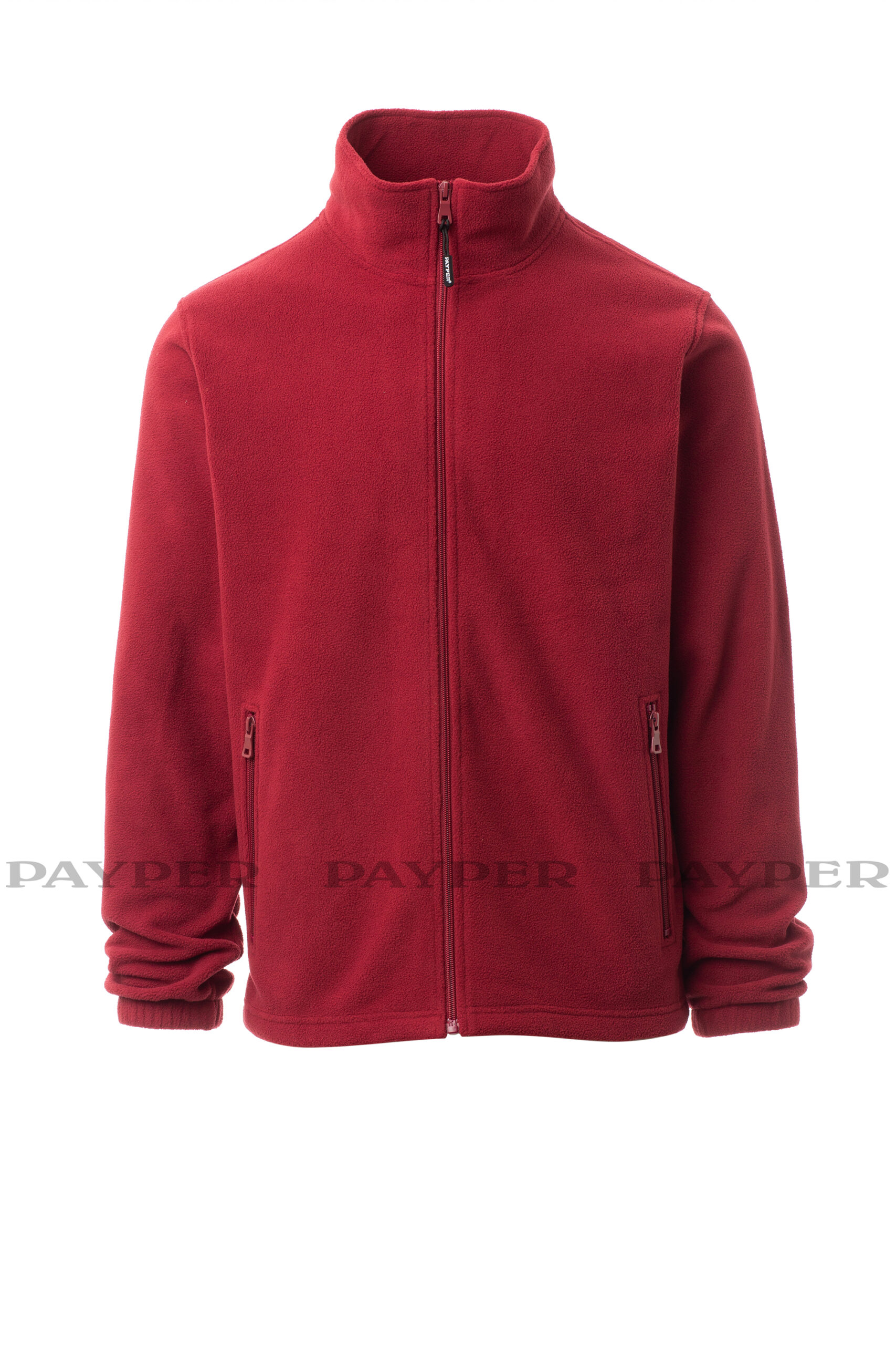 Veste polaire à zip intégral en nylon curseur simple, manches montées, élastiques serre-poignet, deux poches avec zips couverts, coutures renforcées, bas droit.