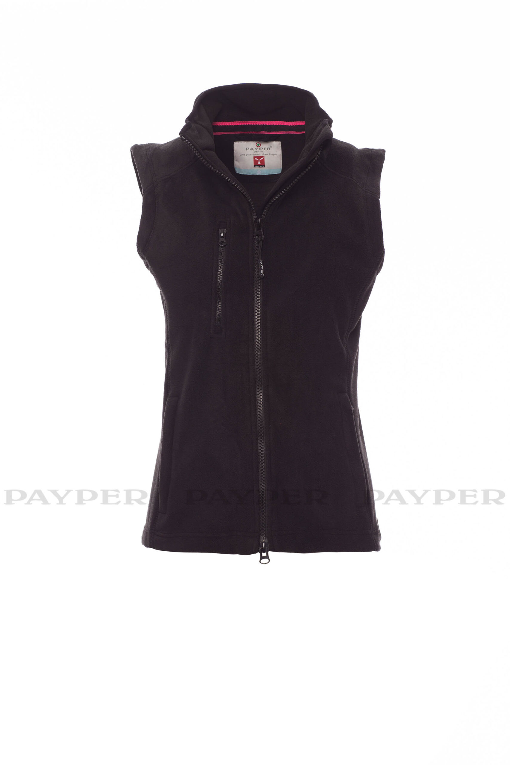 Gilet cintré en polaire pour femme, zip intégral en plastique à double curseur, coupe raglan, deux poches frontales avec zip couvert et une poche poitrine avec zip.