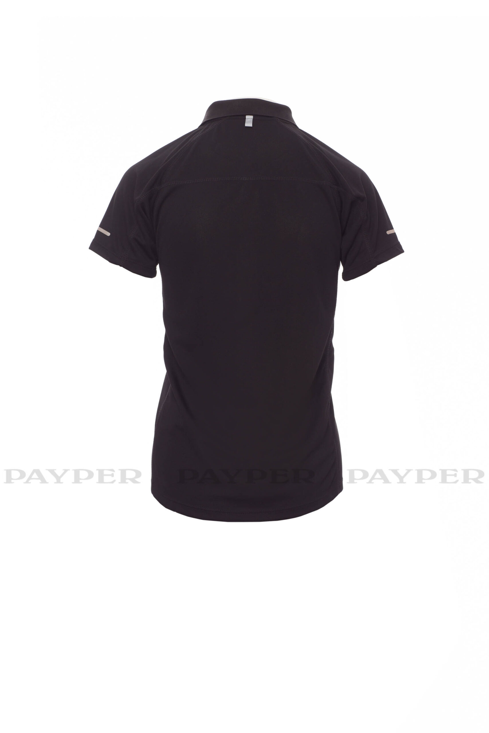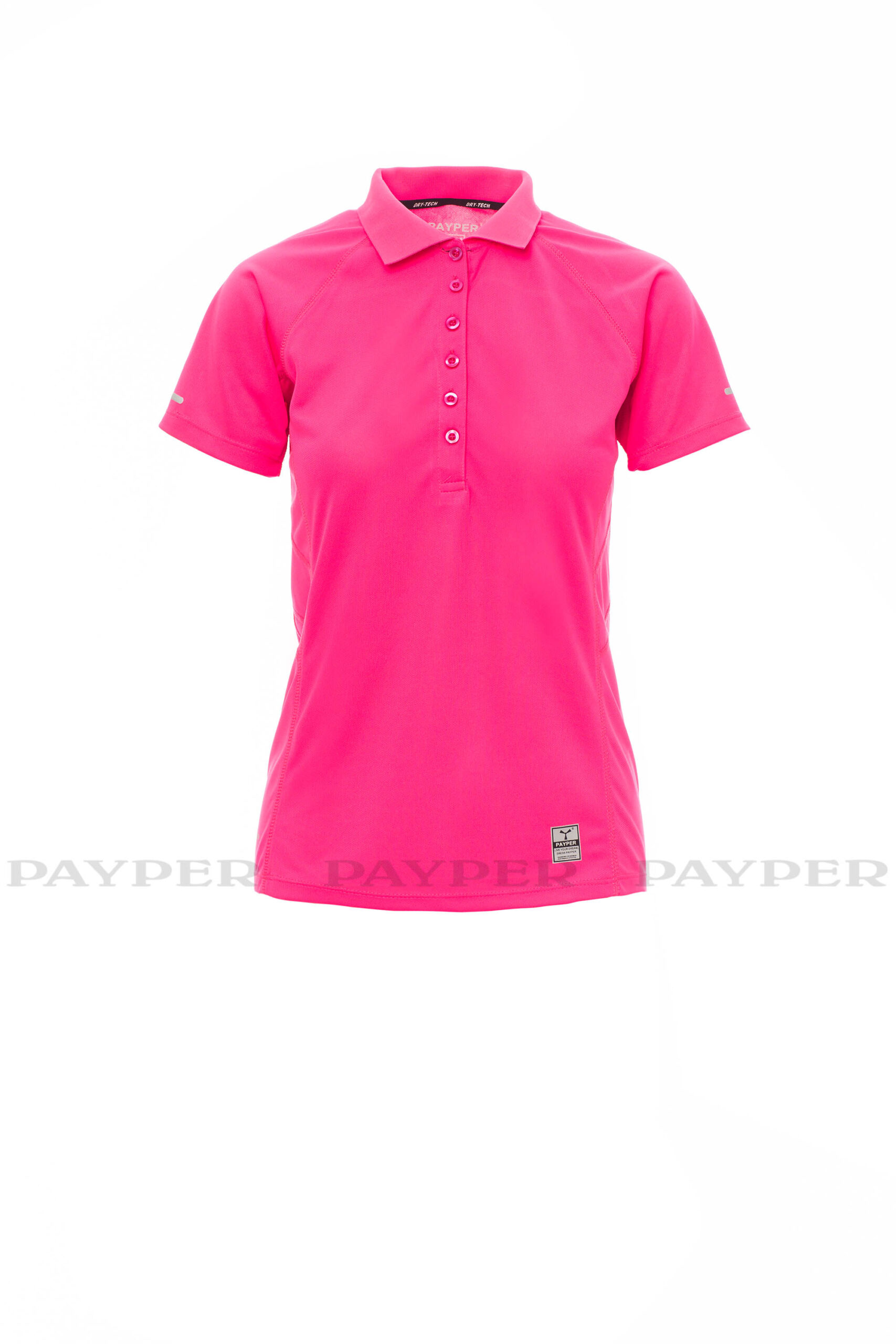 Polo femme technique-sportif cintré, à manches courtes, à six boutons assortis, manches raglan, double couture latérale gage de meilleure portabilité, bas profilé et plus long à l’arrière, insert réfléchissant sur manches et encolure arrière, ruban du col en contraste, étiquette transfert.