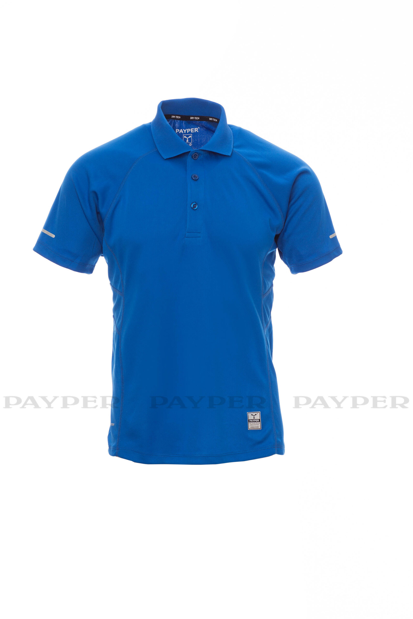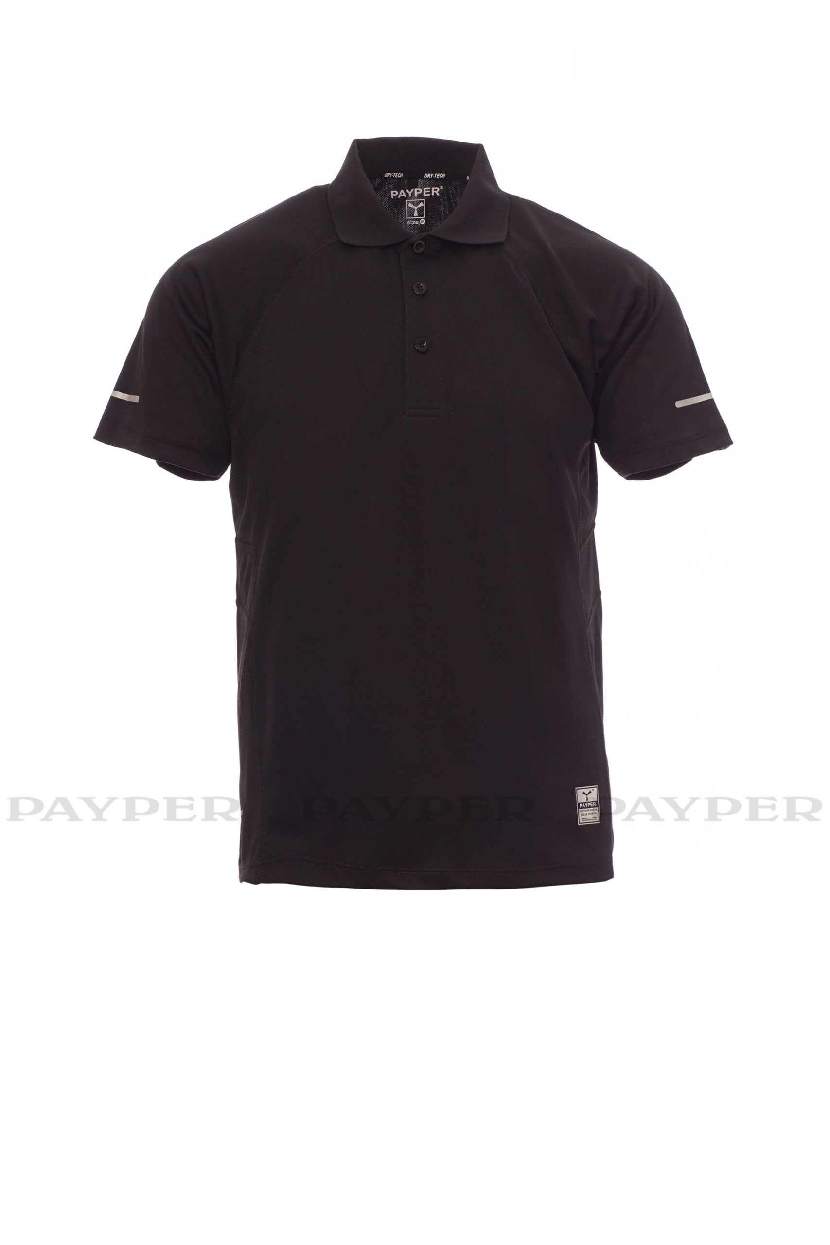 Polo homme technique-sportif, à manches courtes, à trois boutons assortis, manches raglan, double couture latérale gage de meilleure portabilité, bas profilé et plus long à l’arrière, insert réfléchissant sur manches et encolure arrière, ruban du col en contraste, étiquette transfert.