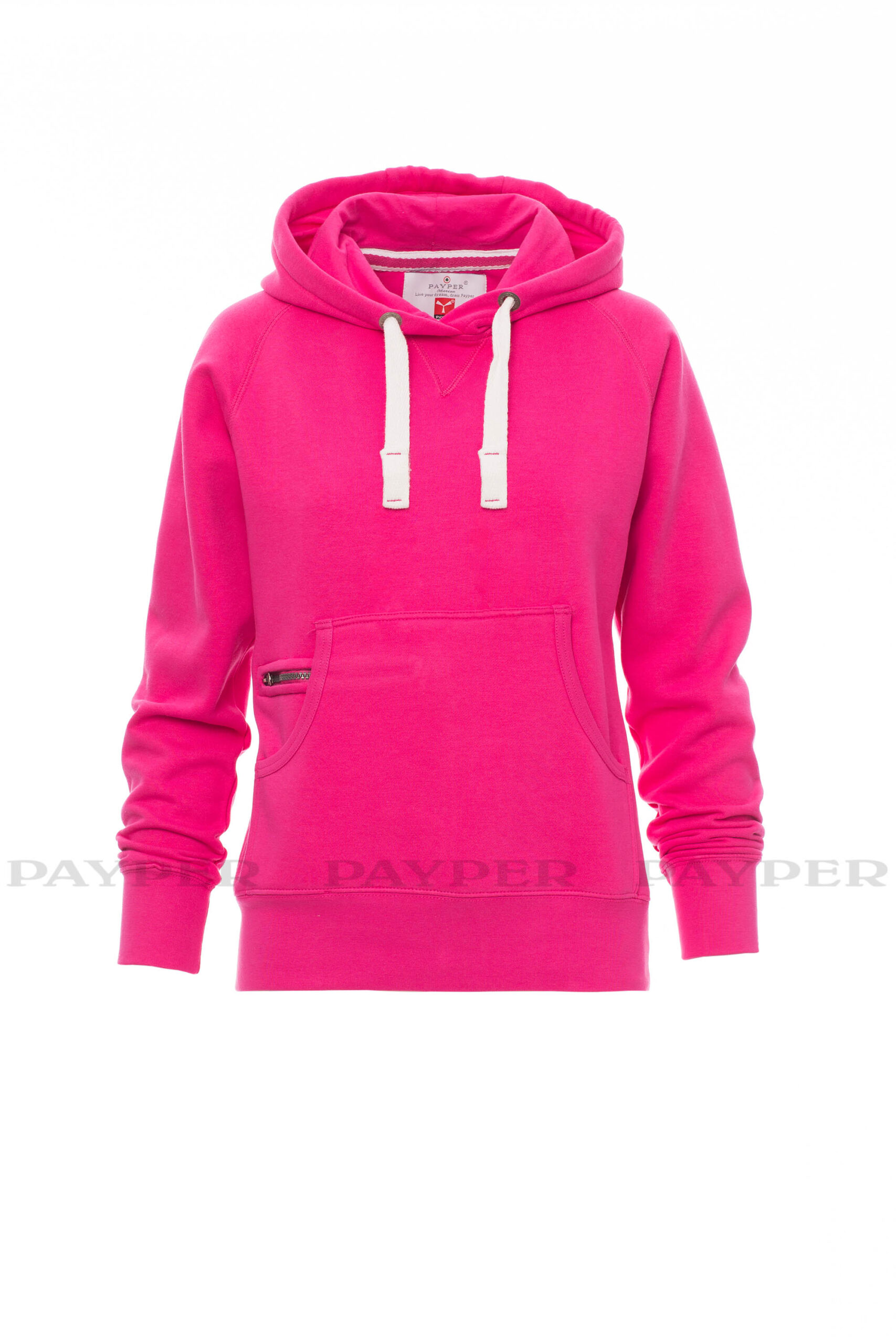 Sweat-shirt femme, coupe cintrée, avec capuche à deux coutures et coulisse en cordon blanc avec coutures teinte assortie et anneaux en métal . Manches raglan, couture esthétique en V au col, poches kangourou, petite poche à zip, poignets et taille en côtes élastiques, coutures renforcées.