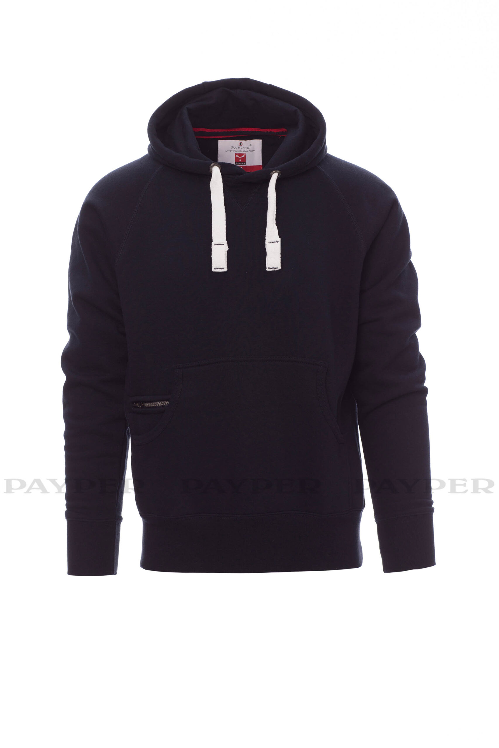Sweat-shirt homme avec capuche à deux coutures et coulisse en cordon blanc à coutures teinte assortie et anneaux en métal . Manches raglan, couture esthétique en V au col, poches kangourou, petite poche zippée, poignets et taille en côtes élastiques, coutures renforcées.