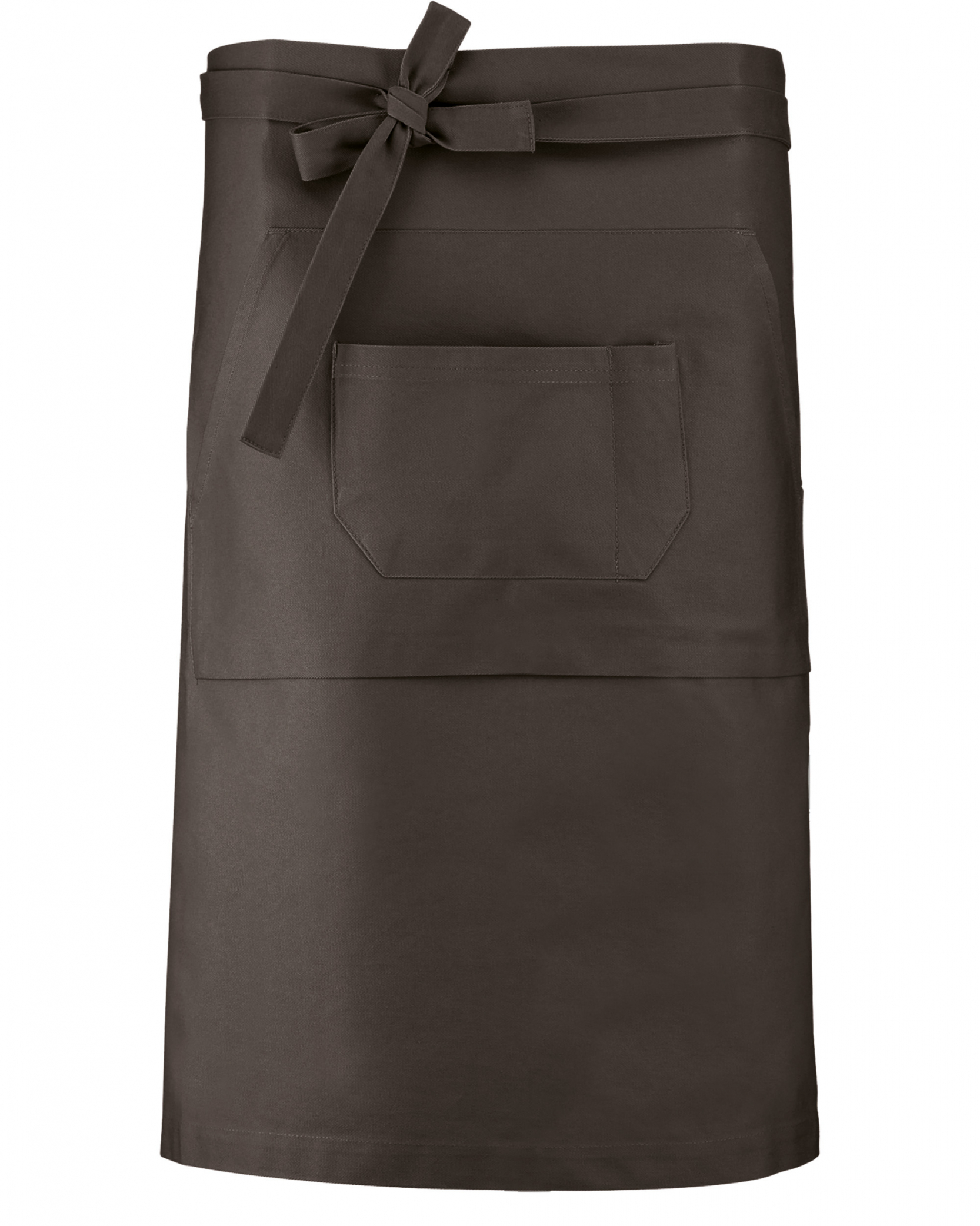 100% coton. Tablier long. 2 poches : 1 poche kangourou et 1 poche divisée en 2 compartiments. Dimension : L 90 cm H 63 cm